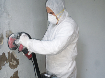 melpilz wird abgetötet. Die betroffene Fläche wird mit einer Spezialfräse in Begleitung eines HEPA Sicherheitssaugers abgefräst und abgesaugt.